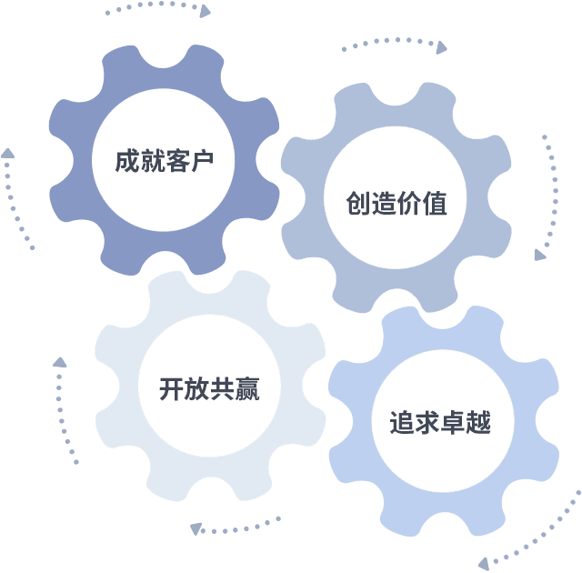 成就客户是一切决策的出发点,,创造价值是衡量所有工作的标准,,追求卓越是我们做事做人的态度,,开放共赢是我们的格局也是最终的结果。。。价值观的齿轮环环相扣,,,,推动着组织里的每个人不断向前。。