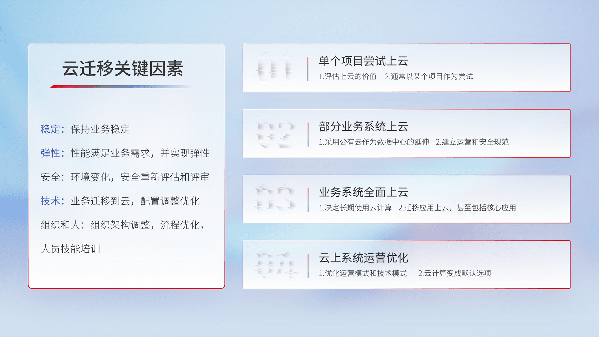 结合实际业务,,,从规划设计、、、云平台选型、、云原生改造、、、、数据迁移、、、集成交付,,迁移全过程为客户识别最佳上云路径,,做好风险识别管理,,设计网络架构、、、身份权限、、安全审计合规、、操作审计、、日志审计、、、、监控告警策略、、、多站点容灾设计等,,,对云上基础设施进行整体规划,,,提升IT治理水平,,以满足弹性、、高可用、、、高性能的需求。。。。